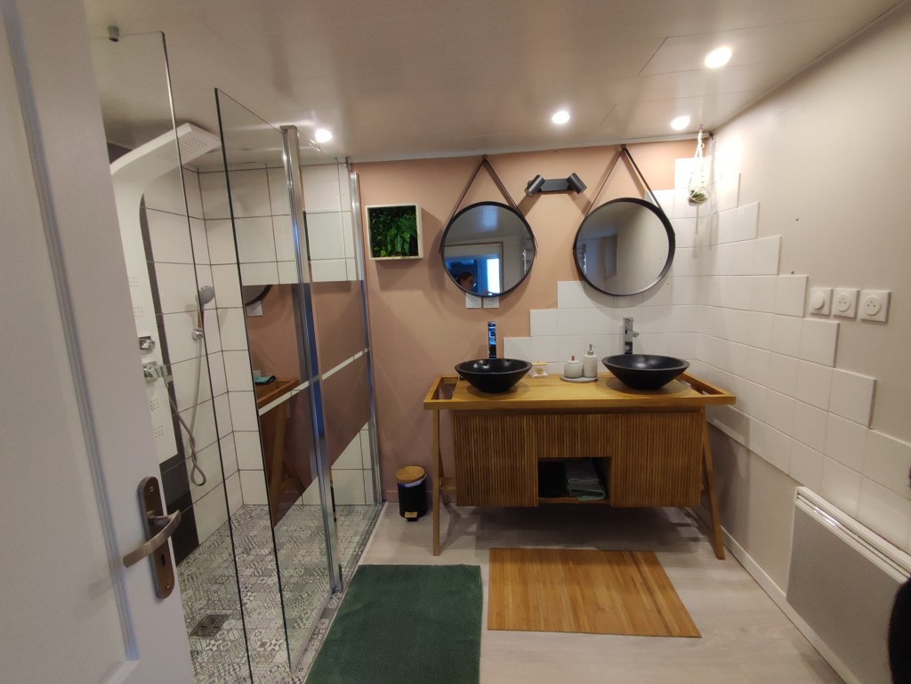 Salle d’eau au rez-de-chaussée avec douche, meuble double vasque et toilettes.